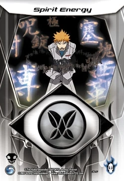 Guardian cards represent the personae of characters in the Bleach universe. Each Guardian has a Power rating that represents the total amount of damage they can take. Each Guardian also has a set of numbers on the left side of the card that represent how much of a particular Energy card that the Guardian can have in their energy deck. Finally, Guardians each have Effects that can be used as indicated on the card. (Effects that require a cost will have the requirements bolded). In addition to regular versions, there are also special Hi-Tech cards that are variants of the regular Guardian cards. These are exclusive to the pre-constructed starter decks. | |