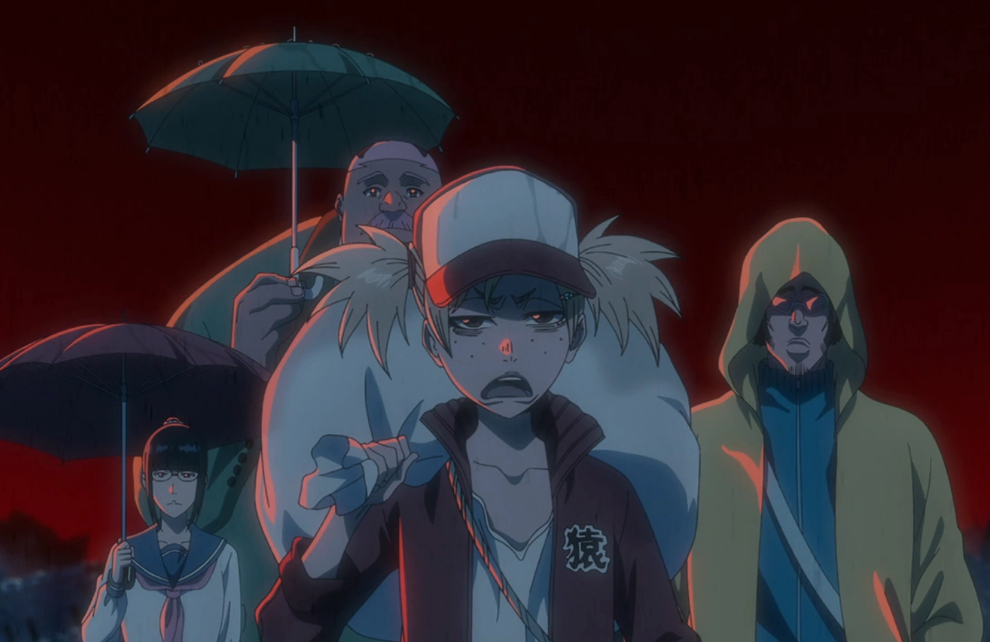 Mayuri Kurotsuchi and Nemu Kurotsuchi emerge from a hidden laboratory in luminescent clothing.