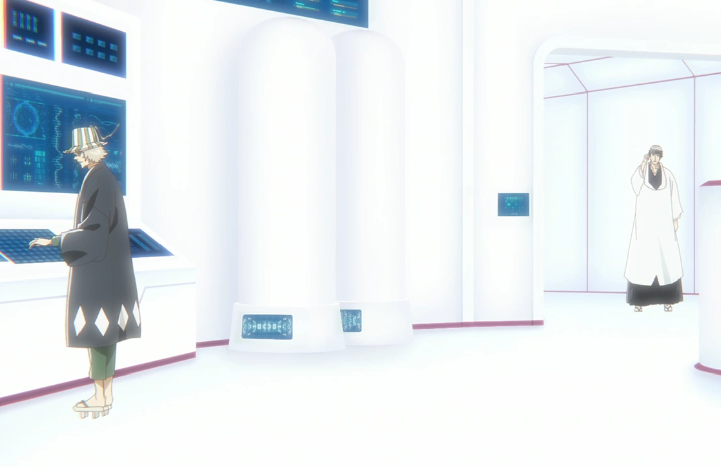 Soon afterward, in Mayuri's hidden laboratory, Urahara types on one of the consoles as Ichigo, Orihime, and Sado stand in front of a replica of KĆ«kaku Shiba's Kakaku TaihĆ,[53] where Ichigo questions when Urahara found time to build it beneath the 12th Division barracks, only for Urahara to reveal that Mayuri is the one who began building the base structure after foreseeing the potential outcome of the Wandenreich invading the Soul King Palace around the time that the Royal Guard visited the Seireitei, with Urahara himself only putting on the finishing touches on it after arriving during the second invasion.[54]