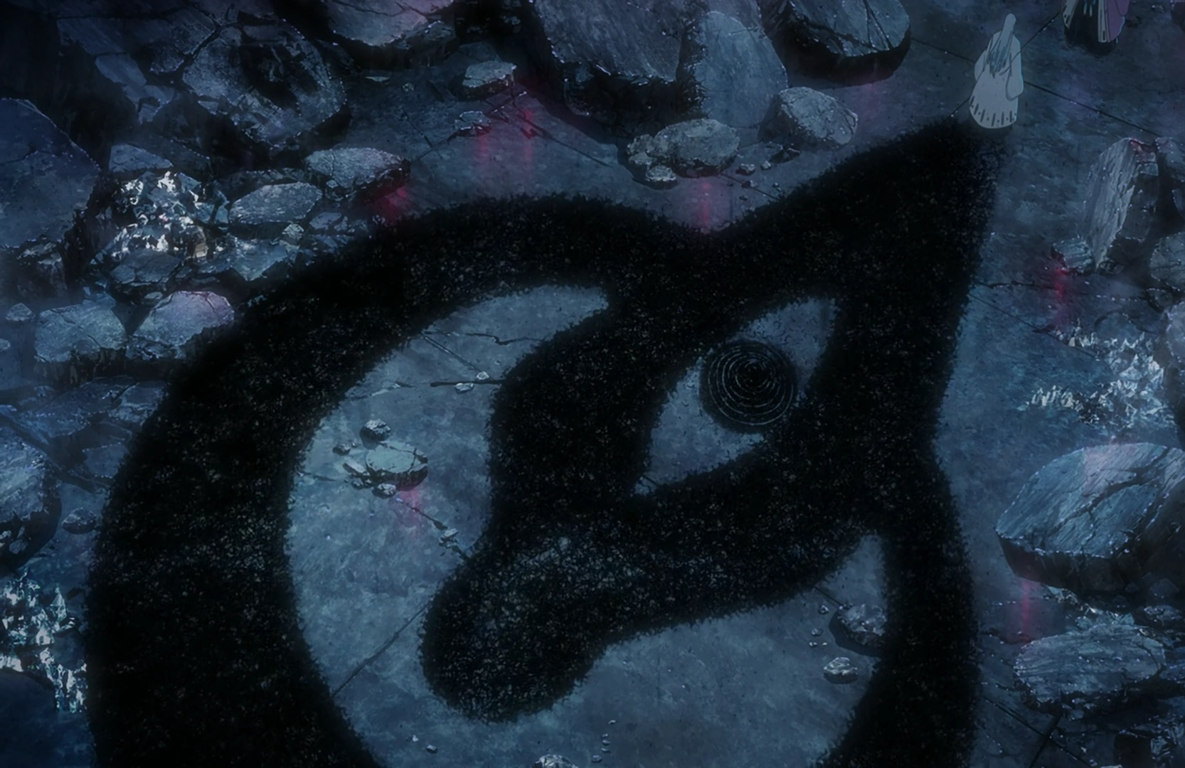 Shortly afterward, Shunsui observes the rubble of the city and wonders if the structures of the Seireitei will return intact even if they remove the Wandenreich before turning to Ukitake, who assures him that they will just rebuild if this does not happen. Admitting that he knew Ukitake would say this, Shunsui hops down to his level and responds to Ukitake stating that the Kamikake was prepared in expectation of the enemy being allowed to invade the Soul King Palace by musing that it was successful as Ukitake's shadow lengthens to form a humanoid silhouette framed by a large ring and with an oversized eye in the center of its chest.[78]