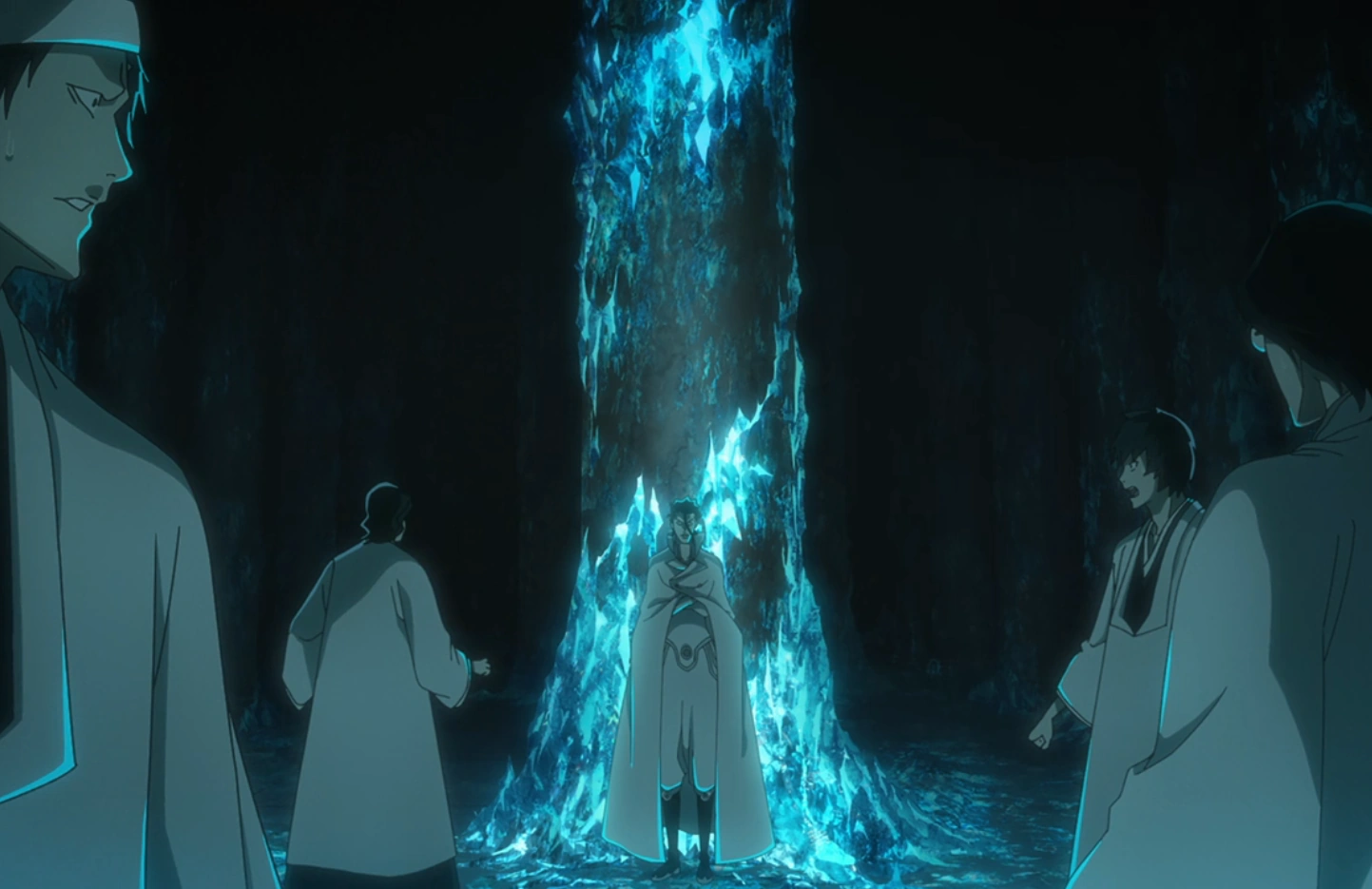 In response to this, Lieutenant Tetsuzaemon Iba blocks one of their swords with his ZanpakutĆ. While 5th Division Lieutenant Momo Hinamori is pushed back across the ground by other Soldat and forces herself to halt by embedding her ZanpakutĆ in the stone, 4th Division Lieutenant Isane Kotetsu hides from more Soldat.[11] Meanwhile, in the former Captain-Commander's office, Haschwalth is cut off from Shunsui and Nanao by Hakudan Keppeki, which he creates a ripple in by tapping it with his sword, causing him to deduce that he cannot get through it and wonder if it is deflecting or instead absorbing his power.[12]