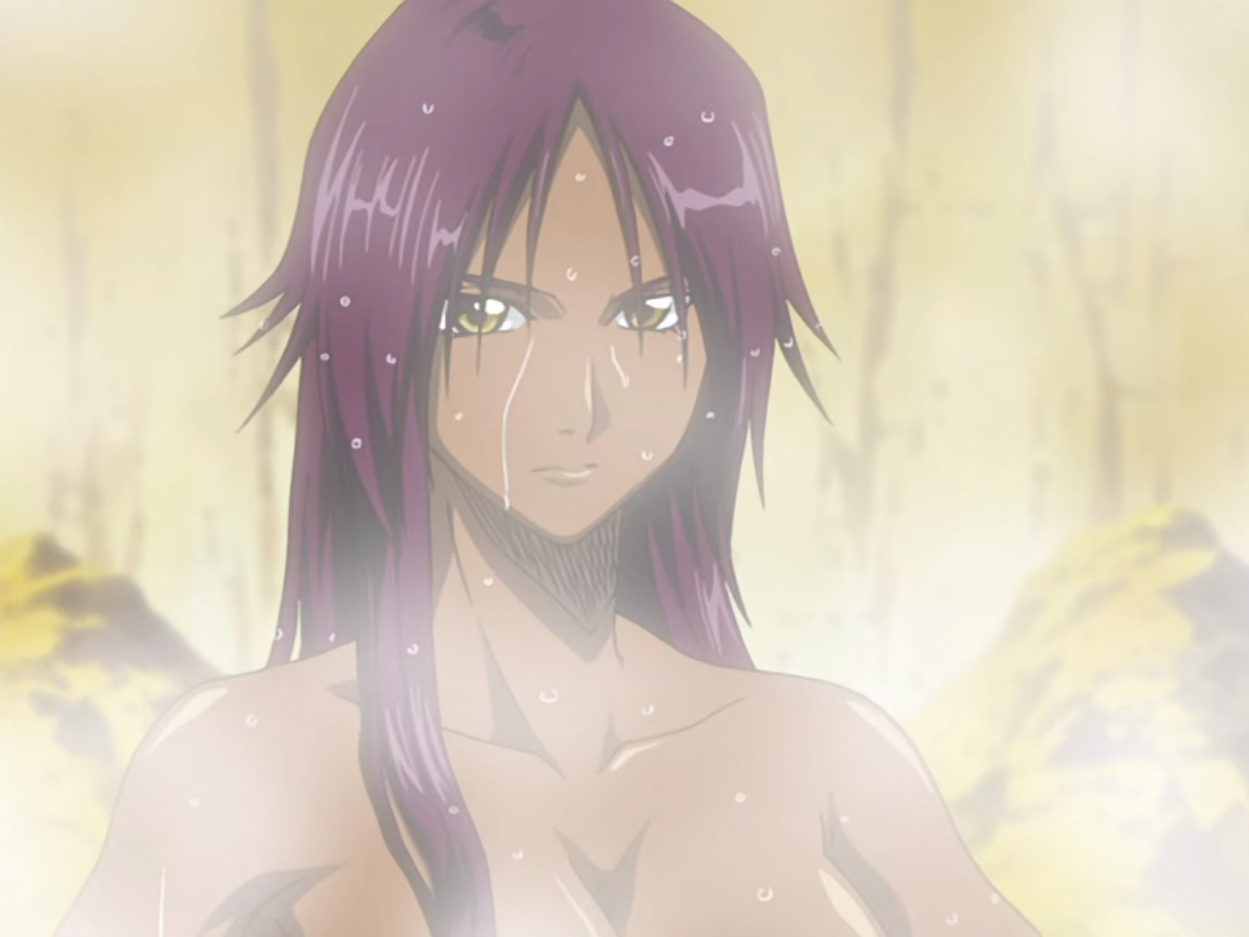 Later, Yoruichi and the others arrive at the palace, where Yoruichi has her fall cushioned by Orihime's Santen Kesshun. Yoruichi notices Ichibē Hyōsube's head lying on the ground and rushes toward the main palace alongside the others after he revives himself and explains the situation.[92] Eventually, Yoruichi and the others arrive at the main palace, where they confront Yhwach.[93] Soon afterward, Yoruichi expresses shock when Ichigo's right side is enveloped in Blut Vene veins upon touching Yhwach's sword.[94]