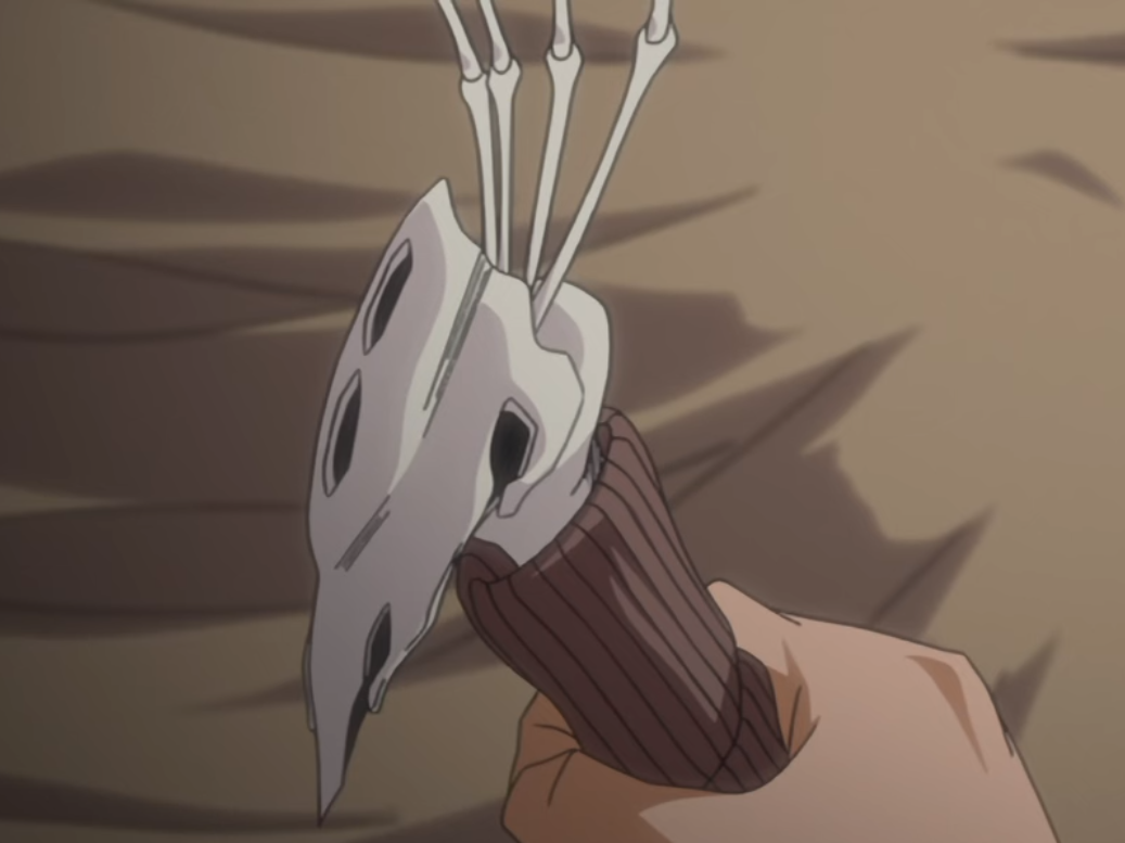 - Ryūkotsujō (竜骨杖, Dragon Bone Jō):[112] A long, beige, bone wand-like artifact, with a small, white, bird-shaped skull, and four protrusions, similar to finger bones, extending from the back of the skull. By channeling Reiryoku into the wand, it produces a tentacle, which acts a harness, and a single bat-like wing manifests from the four bone protrusions, which acts as a one-handed hang-glider. No skill or previous experience is required to use it.[113]