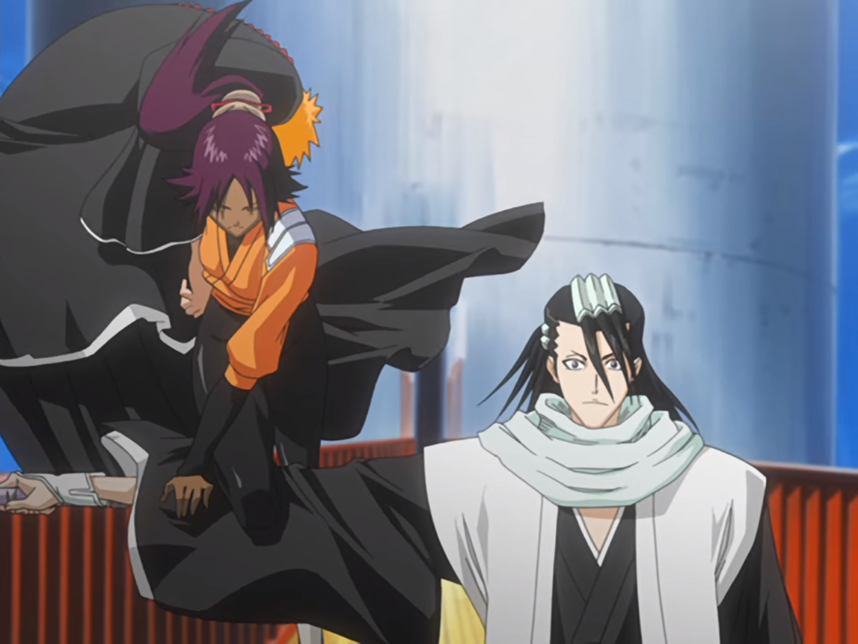 Yoruichi manages to remove her useless arm and lands on one of the floating cities nearby before catching Ichigo and his friends, who are falling on top of Orihime's Santen Kesshun, with two black arrows tied to a nearby post.[99] After waking Ichigo up with a kick and having her arm restored by Orihime, Yoruichi asks the others if it is time to counterattack before having Grimmjow Jaegerjaquez arrive via Garganta.[100] After everyone enters the modified Valley of Screams created by Riruka Dokugamine and Yukio Hans Vorarlberna, Yoruichi explains to Ichigo how they are going to infiltrate the palace using a Garganta and the Valley of Screams.[101]