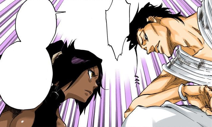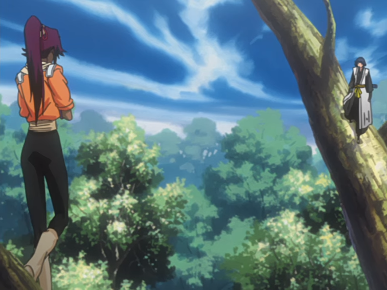 As the blast decimates the nearby area, Yoruichi grabs Orihime and tells her to heal herself, Sado, and Ichigo before going ahead. Telling Orihime that she will be fine, Yoruichi is interrupted when Yūshirō comes flying toward her. When Yoruichi dodges him, Yūshirō quickly wraps himself around her leg, but Yoruichi headbutts him and asks him why he is not with Urahara. Yūshirō replies that with all the Captain-class Shinigami running around, he thought he could come to her rescue, which amuses Yoruichi. She sarcastically tells him that he became a lot stronger, but Yūshirō takes it seriously, to her exasperation. When Askin emerges from the smoke, and Yoruichi tells a healed Ichigo to head off with the others. Ichigo tells her to watch herself, but Yoruichi says it will take a lot more to slow her down as he runs off with Sado and Orihime. Askin watches them run away, and reflects that Yhwach would be angry at him. Askin mocks her attack, causing Yūshirō to fly at him in a rage. Yūshirō uses Shunkō on Askin, and Yoruichi reluctantly commends him for learning a powerful technique in such a short time. However, Askin survives the attack, shocking Yoruichi and Yūshirō, as he says that their Reiatsu could no longer kill him.[107]