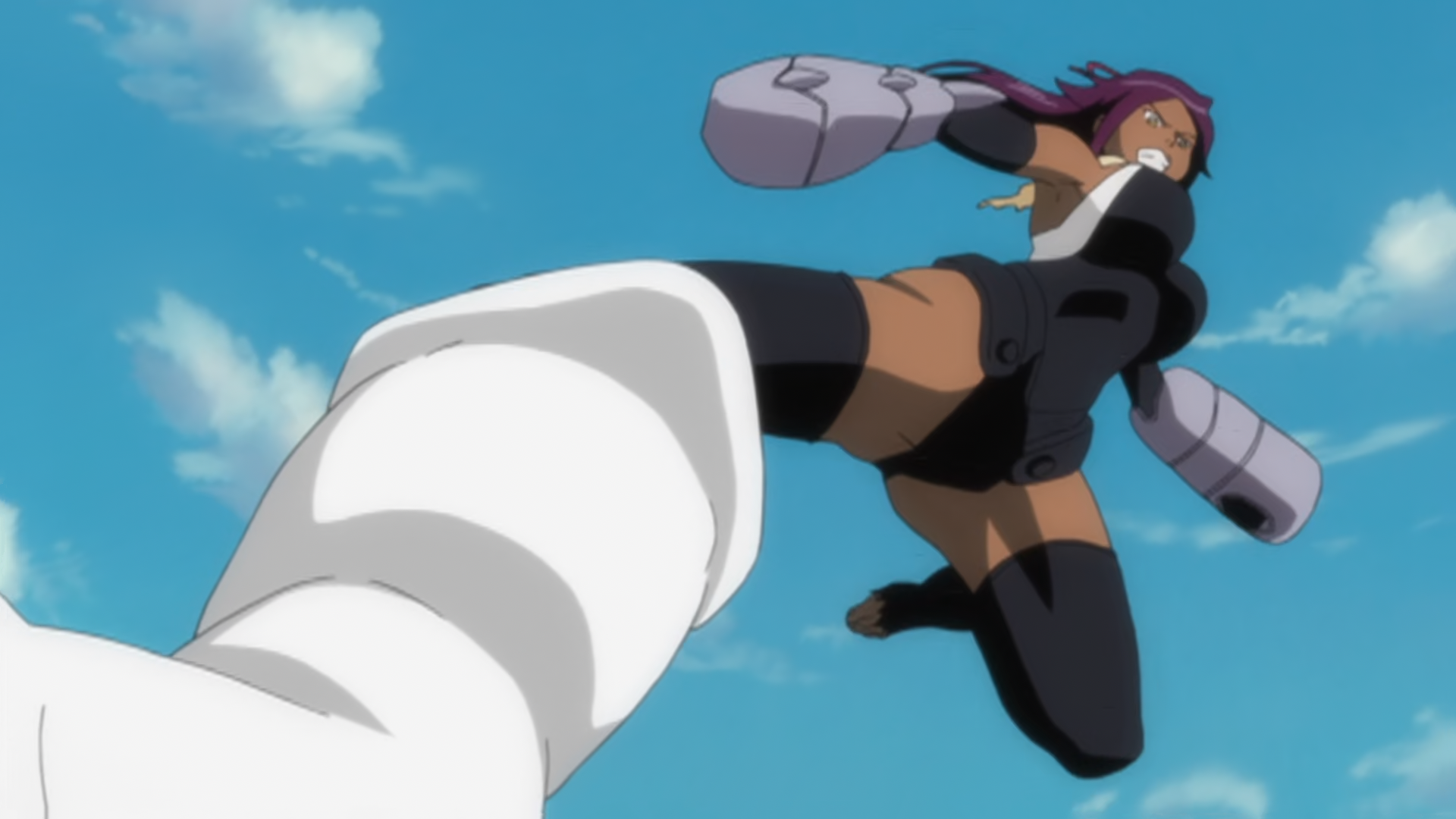 Enhanced Strength: Despite her slender appearance, Yoruichi has incredible physical strength in her Shinigami form. She could still easily use Shunpo while carrying around an unconscious Ichigo to outrun a fellow Shunpo Master.[119] She easily caught a direct punch from Yammy Llargo, and simultaneously threw him several feet away. She easily injured him, despite his thick Hierro, with various unarmed moves, but is injured by his Hierro. Though she admits she wasn't expecting his skin to be that hard, she states she could have avoided taking any damage if she had Shunkō activated.[148][82] A concentrated blow from Yoruichi can destroy an entire city block.[149]