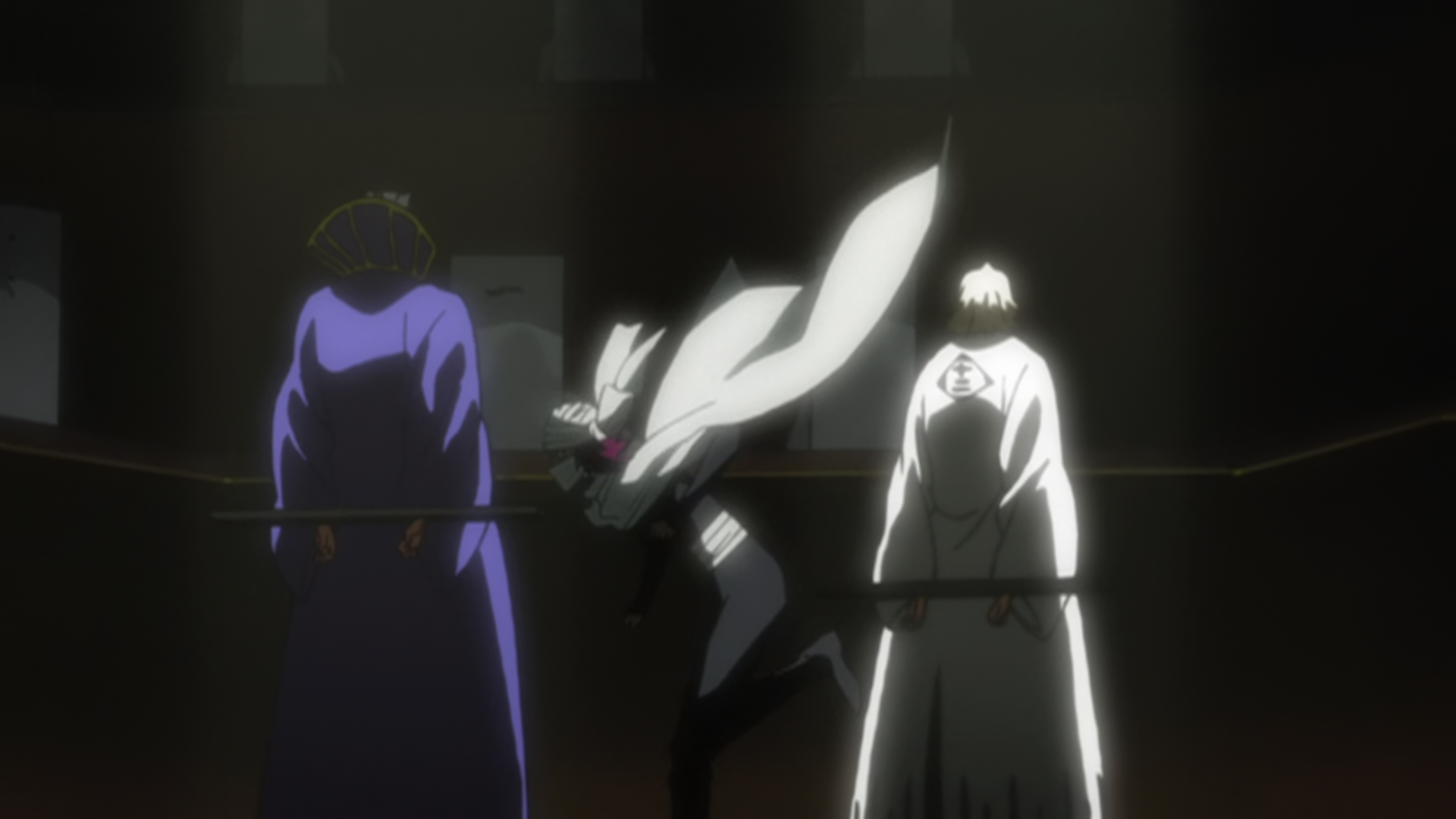 Yoruichi sets up an advanced Kidō barrier to protect Mimihagi.